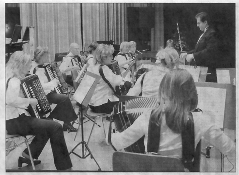 Mörfelden-Walldorf. Der Akkordeon-Club Walldorf spielte beim Konzert in der Stadthalle nicht nur klassische Stücke wie „Die Zauberflöte“ oder Walzer, sondern auch Ohrwürmer der Neuen Deutschen Welle aus den 1980er Jahren. Die rund 200 Zuhörer waren besonders fasziniert von Stücken der Spider Murphy Gang wie „Schickeria“ und „Skandal im Sperrbezirk“, bei dem es heißt: „Unter 32,16,8, herrscht Konjunktur die ganze Nacht.“ Auch Rosi aus dem Sperrbezirk hatte sich nach Walldorf gewagt. Gleich zwei attraktive Mitglieder des Akkordeon-Clubs traten als Rosi auf und hielten ein Schild mit der bedeutenden Telefonnummer in die Höhe: Jennifer und Beate bekamen für ihren Mut sehr viel Beifall.